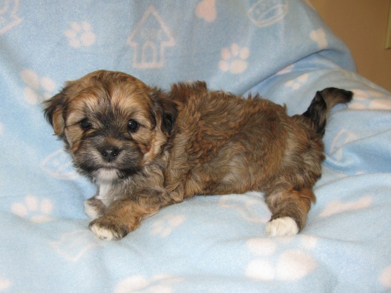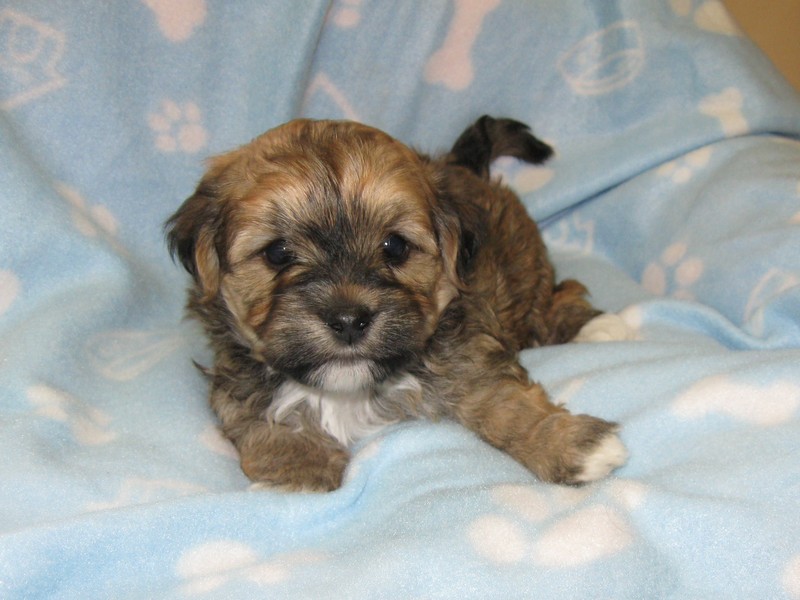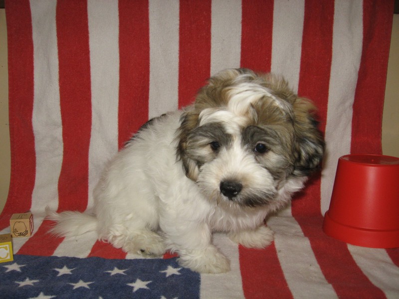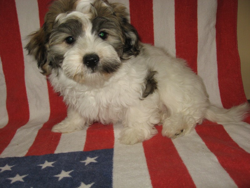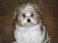 is a handsome brown & white spotted purebred Havanese male!